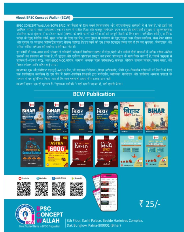 यह पुस्तक BPSC प्रारंभिक (Prelims) एवं मुख्य परीक्षा (Mains) की तैयारी करने वाले अभ्यर्थियों के लिए विशेष रूप से तैयार की गई है। इसमें BPSC का विस्तृत पाठ्यक्रम हिंदी में सरल एवं व्यवस्थित तरीके से प्रस्तुत किया गया है।