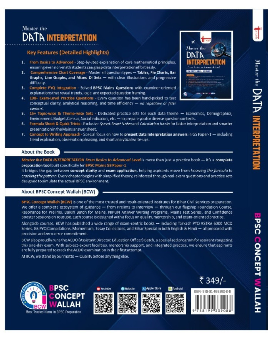 Master the Data Interpretation is a carefully curated and exam-oriented book developed exclusively for BPSC Mains GS Paper-1 aspirants. It focuses on building strong analytical thinking and practical interpretation skills required to decode complex data sets in the examination.
